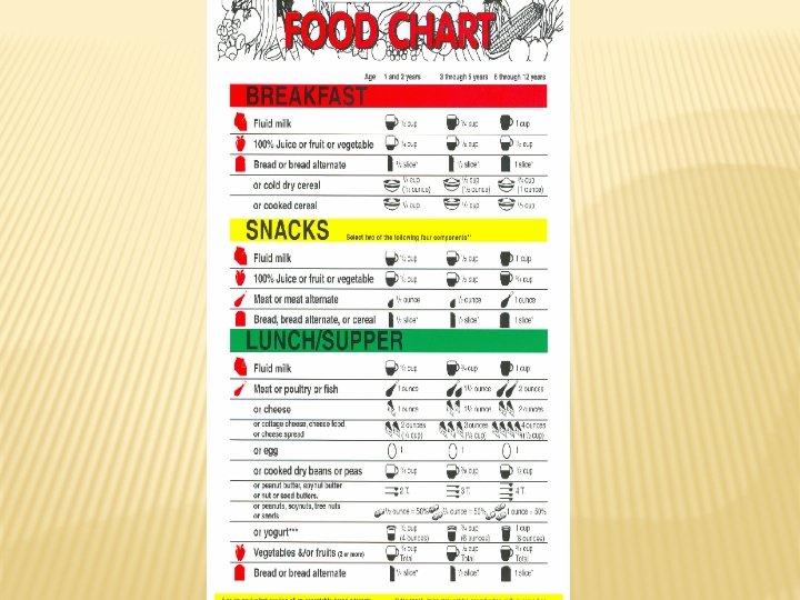 SERVING SIZE (3 -5 YEARS OLD) • Snack: any 2 of the following 4 components: – – ½ cup fluid milk ½ cup vegetable or fruit Bread/Bread Alternative (same as breakfast) Meat/Meat Alternative • • • ½ oz lean meat or poultry or fish OR ½ oz alternative protein OR ½ oz cheese OR 1 egg OR 1/8 cup cooked dry beans or peas OR 2 oz or 1/4 cup yogurt