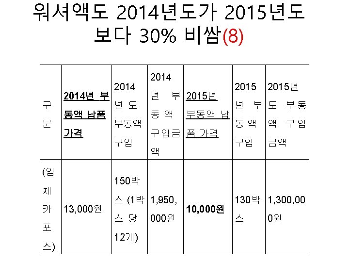 2014 2015 2030 6 2014 2015 2014 0 Slides: 12 Download presentation 와이퍼, 2014년도가 2015년도 보다 약 20~30% 비쌈(6) 2014 수 2015 2014 총금액 0 0 0 4 1, 900 7, 600 MM 75 2, 310 173, 250 150 2, 100 315, 000 MM 255 2, 750 701, 250 300 2, 200 660, 000 품목 규격 1 와이퍼 300 MM 2 와이퍼 350 3 와이퍼 400 량 수량 2015 가격 2015 총 2014 가격 연번 가격 . 4 와이퍼 450 MM 653 3, 190 2, 083, 070 470 2, 400 2, 128, 000 5 와이퍼 500 MM 458 3, 300 1, 511, 400 570 2, 600 1, 482, 000 6 와이퍼 550 MM 557 3, 850 2, 144, 450 300 2, 900 870, 000 7 와이퍼 600 MM 588 3, 960 2, 328, 480 530 3, 550 1, 881, 500 8 와이퍼 650 MM 268 4, 200 1, 125, 600 150 3, 900 585, 000 전구가격 2014년도가 2015년도 보다 약 100% 비쌈(7) 연 품목 번 1 2 3 전구H 4 전구H 7 전구H 8 규 2014년 격 수량 개 개 개 24 48 10 단가 4, 840 5, 500 4, 500 2014 2015 년 년 금액 수량 116, 160 264, 000 45, 0 00 30 60 10 2015년 단가 2, 000 3, 500 2015 년 금 액 60, 00 0 120, 0 00 35, 00 0 비 고
