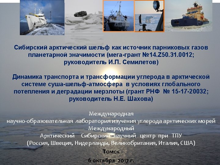 10. Salvadó, J. A. , Tesi, T. , Sundbom, M. , Karlsson, E. , Kruså, M. , Semiletov, I. P. , Panova, E. , and Gustafsson, Ö. : Contrasting composition of terrigenous organic matter in the dissolved, particulate and sedimentary organic carbon pools on the outer East Siberian Arctic Shelf, Biogeosciences, 13, 6121 -6138, doi: 10. 5194/bg-13 -6121 -2016, 2016. 11. Sparkes, R. B. , Doğrul Selver, A. , Gustafsson, Ö. , Semiletov, I. P. , Haghipour, N. , Wacker, L. , Eglinton, T. I. , Talbot, H. M. , and van Dongen, B. E. : Macromolecular composition of terrestrial and marine organic matter in sediments across the East Siberian Arctic Shelf, The Cryosphere, 10, 2485 -2500, doi: 10. 5194/tc-10 -24852016, 2016. 12. Bröder, L. , Tesi, T. , Salvadó, J. A. , Semiletov, I. P. , Dudarev, O. V. , and Gustafsson, Ö. : Fate of terrigenous organic matter across the Laptev Sea from the mouth of the Lena River to the deep sea of the Arctic interior, Biogeosciences, 13, 5003 -5019, doi: 10. 5194/bg-13 -5003 -2016, 2016. 13. Bischoff, J. , Sparkes, R. B. , Doğrul Selver, A. , Spencer, R. G. M. , Gustafsson, Ö. , Semiletov, I. P. , Dudarev, O. V. , Wagner, D. , Rivkina, E. , van Dongen, B. E. , and Talbot, H. M. : Source, transport and fate of soil organic matter inferred from microbial biomarker lipids on the East Siberian Arctic Shelf, Biogeosciences, 13, 4899 -4914, doi: 10. 5194/bg-13 -4899 -2016, 2016. 14. Гресов А. И. , Шахова Н. Е. , Сергиенко В. И. , Яцук А. В. , Семилетов И. П. Изотопно-геохимические показатели углеводородных газов донных осадков шельфа Восточно-Сибирского моря // Доклады Академии наук, 2016, т. 469, № 6, С. 711 -713. 15. Кошурников А. В. , Тумской В. Е. , Шахова Н. Е. , Сергиенко В. И. , Дударев О. В. , Гунар А. Ю. , Пушкарев П. Ю. , Семилетов И. П. , Кошурников А. А. Первый опыт электромагнитного зондирования для картирования кровли подводной мерзлоты на шельфе моря Лаптевых // Доклады Академии наук, 2016, т. 469, № 5, С. 616 -620. 16. Karlsson, E. , J. Gelting, T. Tesi, B. van Dongen, A. Andersson, I. Semiletov, A. Charkin, O. Dudarev, and Gustafsson Ö. Different sources and degradation state of dissolved, particulate, and sedimentary organic matter along the Eurasian Arctic coastal margin // Global Biogeochem. Cycles, 2016, 30, 898– 919, doi: 10. 1002/2015 GB 005307. 17. Tesi, T. , Muschitiello, F. , Smittenberg, R. H. , Jakobsson, M. , Vonk, J. E. , Hill, P. , Andersson, A. , Kirchner, N. , Noormets, R. , Dudarev, O. , Semiletov, I. , Gustafsson, O. Massive remobilization of permafrost carbon during post-glacial warming // Nature Communications, 7, 13653, 2016.