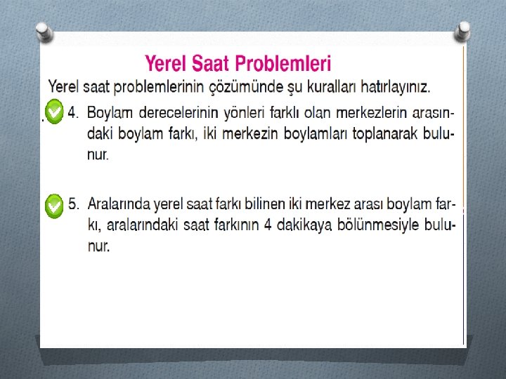 Türkiye 26 – 45 Doğu Meridyenleri Arasında Olduğu İçin: 1– 2. ve 3. saat diliminde yer alır. Dünya’da 24 saat 15 derecelik dilimlere ayrıldığı için 2. saat dilimi 30 ° doğu meridyenine (İzmit), 3. saat dilimi de 45° doğu meridyenine (Iğdır) denk gelmektedir. 2– Başlangıç meridyeninin doğusunda bulunur. 3– Türkiyenin matematik konumuna bağlı olarak doğusu ile batısı arasında 76 dakikalık zaman farkı vardır.