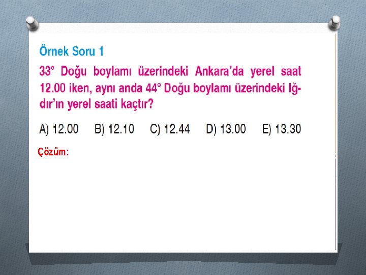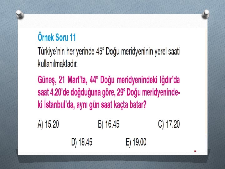 Türkiye 26 – 45 Doğu Meridyenleri Arasında Olduğu İçin: 4 -Gün ışığından daha fazla yararlanmak amacıyla kış aylarında 30 doğu boylamı olan İzmit’in, yaz aylarında da 46 doğu boylamı olan Iğdır’ın yerel saati ulusal saat olarak kullanılır. NOT: Bu bilgiye bağlı olarak kış aylarında İzmit’e uzak olan yerlerde, yaz aylarında da Iğdır’a uzak olan yerlerde yerel saat ile ortak saat arasındaki fark fazla olmaktadır.