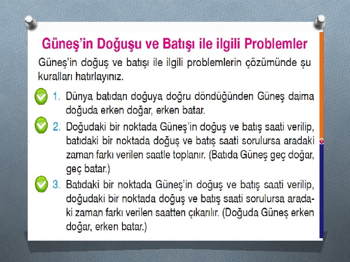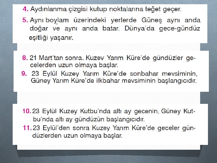 Türkiye Kuzey Yarım Küre’de Bulunduğu için: 5– İki meridyen arası mesafe kuzeyden güneye doğru artmaktadır. Ayrıca kuzeyden güneye doğru gece – gündüz süre farkı azalır. *** Sadece Kuzey Yarım Küre için bu böyledir. Güney yarım Küre’de tersidir. Ayrıca bu dünyanın geoid bir şekle sahip olmasından kaynaklanır. 6– 21 Mart ve 23 Eylül tarihinde Dünya’nın her yerinde gece gündüz eşitliği yani ekinoks yaşanır. ***Buradan çıkarmamız gereken şu olmalıdır: 21 Marttan ve 23 Eylüle kadar Türkiye’de gündüzler geceden daha uzun, 23 Eylülden 21 Marta kadar olan tarihte ise geceler gündüzden daha uzundur.
