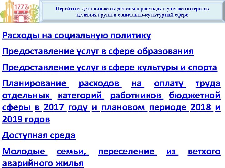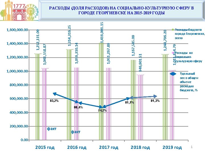 2015 2019 1 200 000 00 374 949 Slides: 4 Download presentation СТРУКТУРА РАСХОДОВ НА ОТРАСЛИ СОЦИАЛЬНО-КУЛЬТУРНОЙ СФЕРЫ В 2015 -2019 ГОДАХ 1, 200, 000. 00 374, 949. 62 35, 269. 39 341, 814. 04 567, 577. 07 601, 595. 78 37, 210. 40 621, 439. 07 0. 00 614, 511. 31 200, 000. 00 Социальная политика 587, 209. 92 600, 000. 00 400, 000. 00 52, 866. 95 41, 338. 22 416, 727. 16 37, 621. 79 800, 000. 00 400, 460. 61 1, 000. 00 376, 961. 87 Тыс. рублей факт 2015 год факт 2016 год 2017 год 2018 год 2019 год Культура и спорт Образование