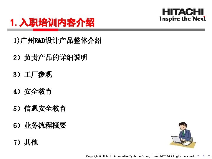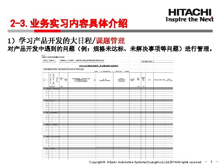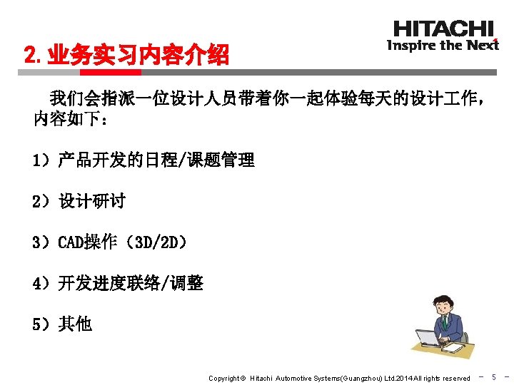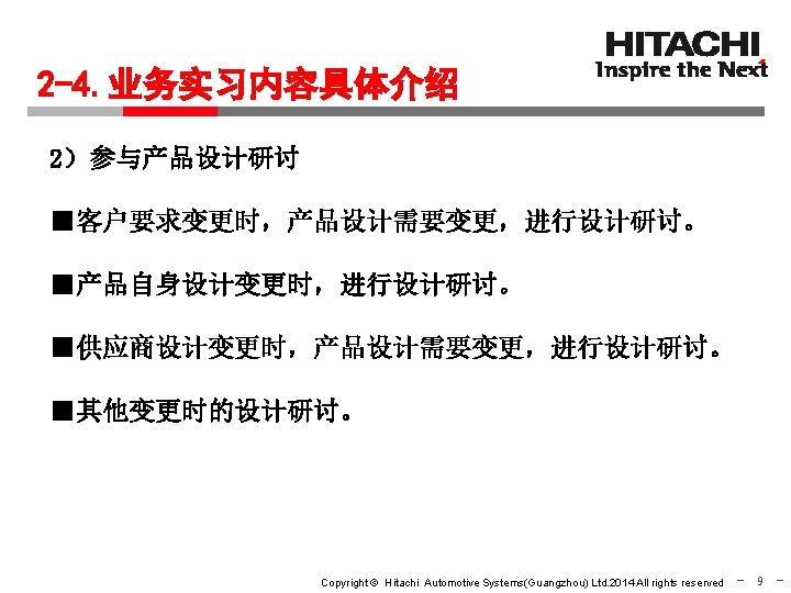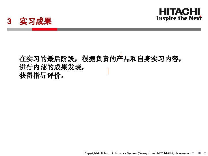2015 Copyright Hitachi Automotive SystemsGuangzhou Ltd 2014 All Slides: 11 Download presentation 同济大学汽车学院 2015年度 毕业生企业实习说明会 日立汽车系统(中国)有限公司 Copyright © Hitachi Automotive Systems(Guangzhou) Ltd. 2014 All rights reserved - 1 - 实习生进入企业 到底实习什么? Copyright © Hitachi Automotive Systems(Guangzhou) Ltd. 2014 All rights reserved - 2 - 广州研发中心实习介绍 实习流程 1 入职培训 2 业务实习 3 成果报告 Copyright © Hitachi Automotive Systems(Guangzhou) Ltd. 2014 All rights reserved 3 - 2 -1. 业务实习内容具体介绍 广州研发中心主要产品 INJ HPP 平衡器 ABS/ESC Copyright © Hitachi Automotive Systems(Guangzhou) Ltd. 2014 All rights reserved - 6 - 期待你的参与! Copyright © Hitachi Automotive Systems(Guangzhou) Ltd. 2014 All rights reserved - 11 -