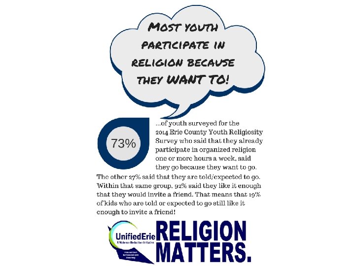 Participation vs. Importance Do you participate in organized religion 1 or more hours per week? Do you think religion matters? Yes 37% No 63% Only 37% of youth said they participate weekly but 51% said religion is important and matters a lot. That means a large number of students who don’t currently attend regularly are open to it and think it is important. 2014 Erie County PA Youth Religiosity Survey It is not important, it doesn't matter. 17% I don't know what I think about it neutral. 32% It is important, it matters a lot. 51%