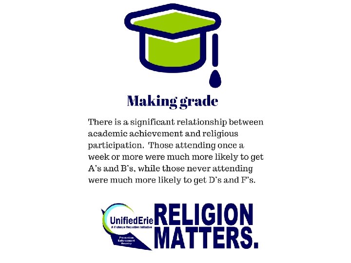Relationship of Religious Participation Relationship of Religious Activity Attendance and Academic Achievement and 54, 7 46, 8 42, 7 37, 2 33, 4 31, 6 28, 4 22, 8 24, 7 29, 8 24, 1 18, 9 15 15 Mostly As Mostly A's Mostly B's Never Attends Mostly C's Rarely Attends Erie County PA , 2013 PA Youth Survey Mostly Ds Mostly D's Attends about Once a week or more There is a significant relationship between academic achievement and religious participation. Those attending once a week or more were much more likely to get A’s an B’s, while those never attending were much more likely to get D’s and F’s. 14, 9 13, 7 Mostly Fs Mostly F's