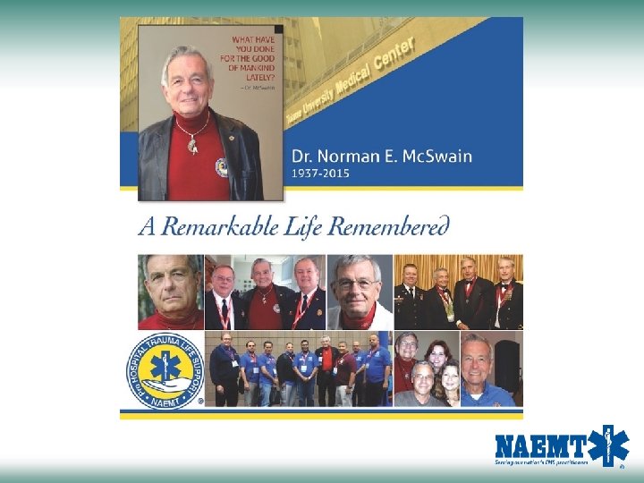 EMS Safety • All NAEMT instructors are eligible to teach the 2 nd edition EMS Safety Provider course, simply by: – Taking the provider course – Taking the online NAEMT Instructor Course – No monitoring is required • EMS practitioners need this course, so please teach it!