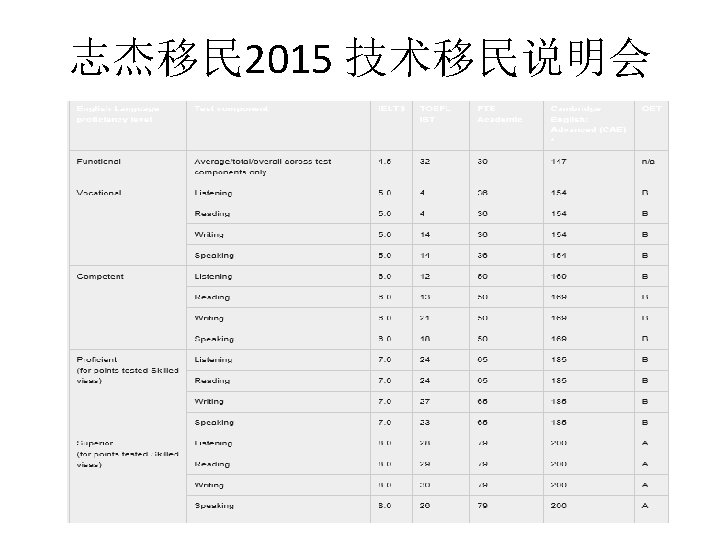志杰移民 2015 技术移民说明会 Factor Age English language ability Test results must be no older than three years immediately before the day on which the visa application was made. Description Points 18– 24 years 25 25– 32 years 30 33– 39 years 25 40– 44 years 15 45– 49 years 0 Competent English 0 Proficient English 10 Superior English 20