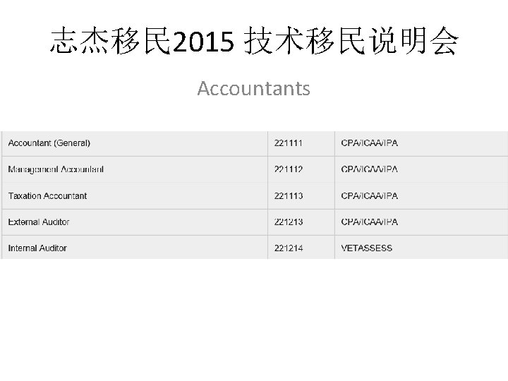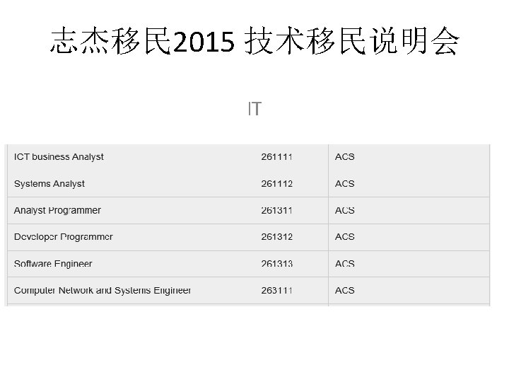 志杰移民 2015 技术移民说明会 Occupation ID Description Points score Visa date of effect 2211 Accountants 60 04/12/2014 5: 13 PM 2611 ICT Business and Systems Analysts 60 27/11/2014 4: 08 PM 2613 Software and Applications Programmers 60 07/12/2014 10: 54 PM