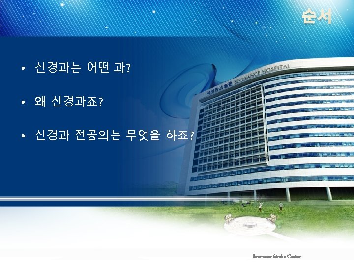 왜 신경과죠? • Neuroscience가 대세! • King of doctor/special consultant • Aging society • Government requires more neurologist Severance Stroke Center