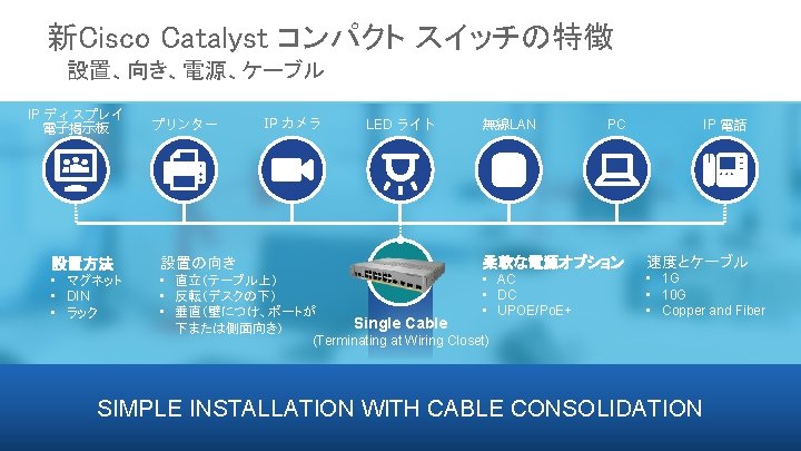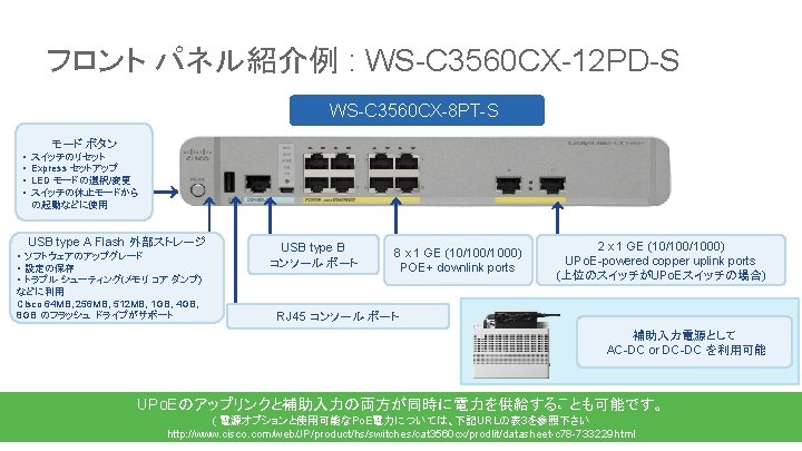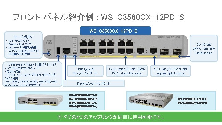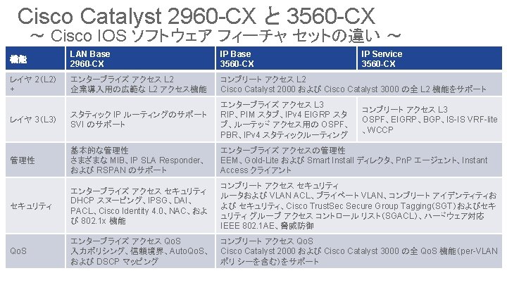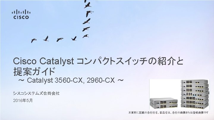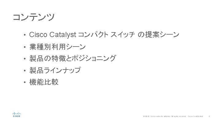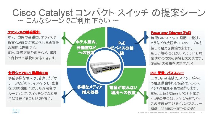 既存製品(Cisco Catalyst 3560 -CG) との比較 Feature 3560 -CG 3560 -CX Uplinks 2 x 1 GE copper or 2 X 1 Gb SFP 2 x 1 GE copper and 2 x 10 GE SFP+ (SKU option) Downlinks 8 x 1 GE copper 12 x 1 GE copper m. Gig/10 GE Cu No Downlinks (SKU option) Po. E 124 W Po. E+ 240 W Po. E+ Po. E passthrough 1 x UPOE, 23. 8 W 2 x UPOE, 148. 8 W DC power No Yes Perpetual Po. E No Yes Instant access No Yes (10 GE SKU) Security 802. 1 x, MACsec, SXP AVC No Net. Flow-Lite IPv 6 Basic Enhanced Cisco IOS® Software IP Base only IP Base, IP Services (upgradable) Hardware DRAM, Flash 128 MB, 64 MB Ports Po. E Ease of Management Other © 2016 Cisco and/or its affiliates. All rights reserved. Cisco Confidential 512 MB, 128 MB 24