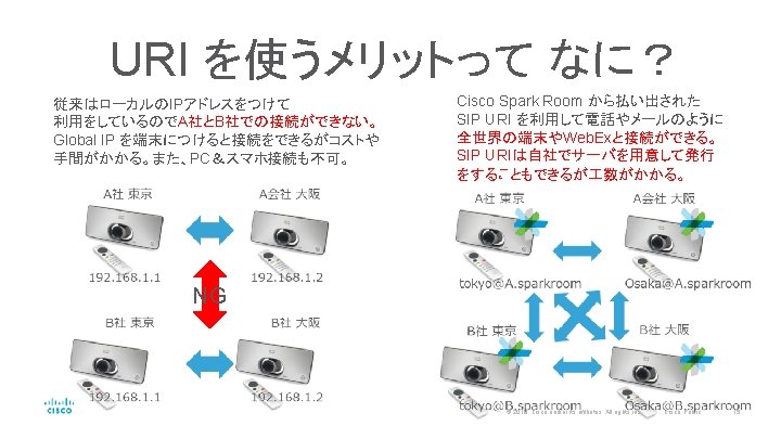 Cisco Spark Room 利用は3ステップ XXX@XXX. room. sparkroom お好きな専用機を 購入する 管理者専用サイト からコードを作成 し 端末に入力 Cisco からアドレス (URI) を払い出し © 2016 Cisco and/or its affiliates. All rights reserved. Cisco Public 14