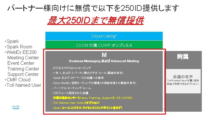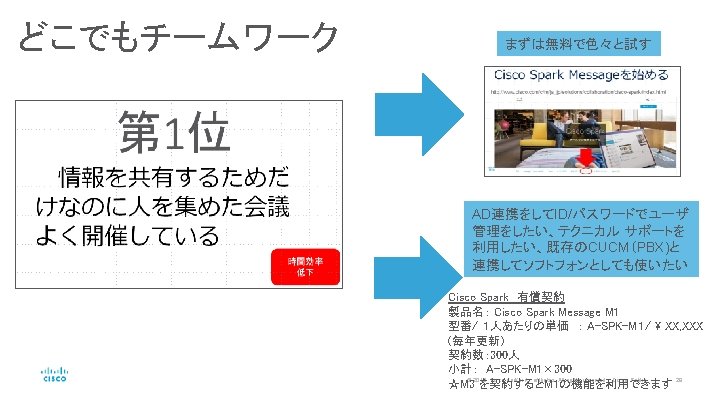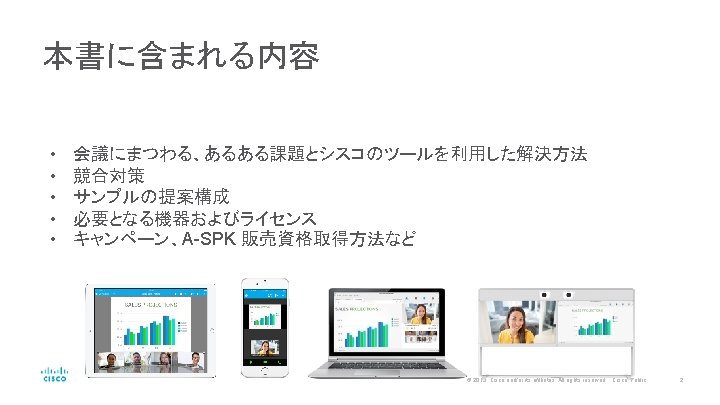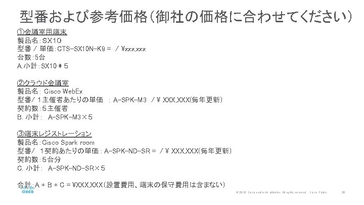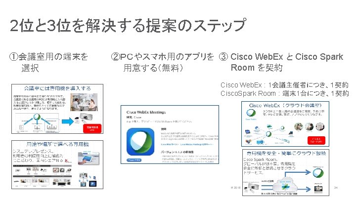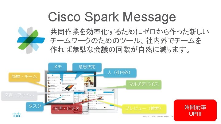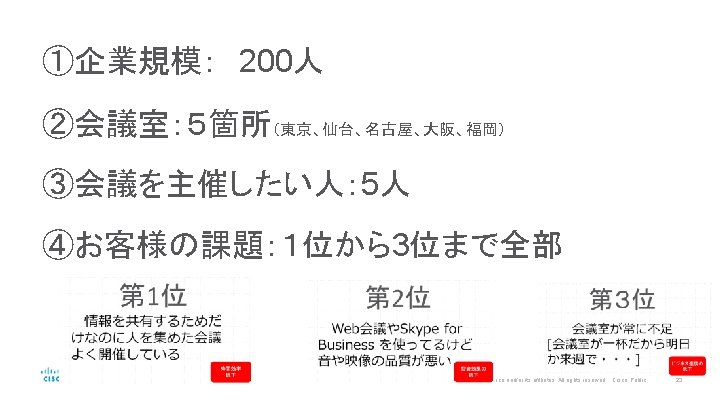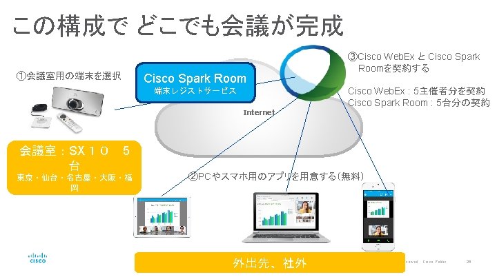 提案サンプル どこでも会議:専用機+Cisco Web. Ex+Cisco Spark Room どこでもチームワーク:Cisco Spark Message © 2016 Cisco and/or its affiliates. All rights reserved. Cisco Public 22