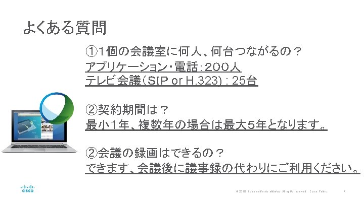 Cisco Web. Ex だけが実現できる なんでも接続 XXX@XXX. webex. com 03 -XXXX-XXX http: //XXX. webex. com ガラケー、固定電話、スマホ で接続。 PCやスマホのブラウザ or アプリで接続。 高品質の専用機で接続。 Skype for Business も繋がる。 © 2016 Cisco and/or its affiliates. All rights reserved. Cisco Public 6