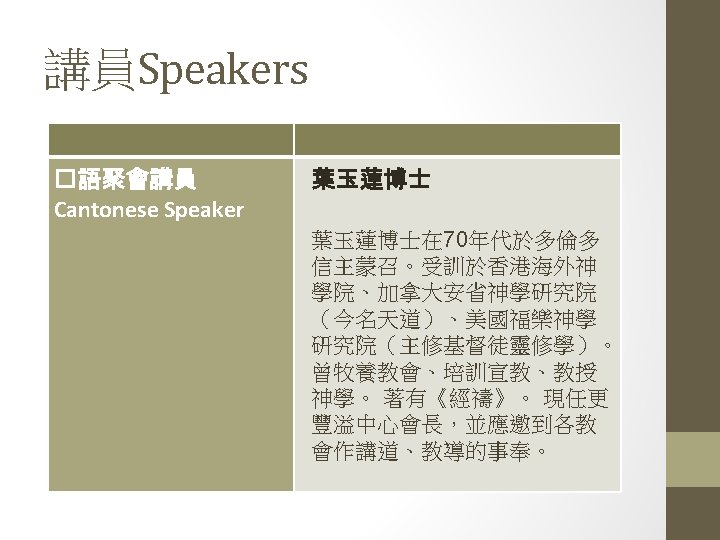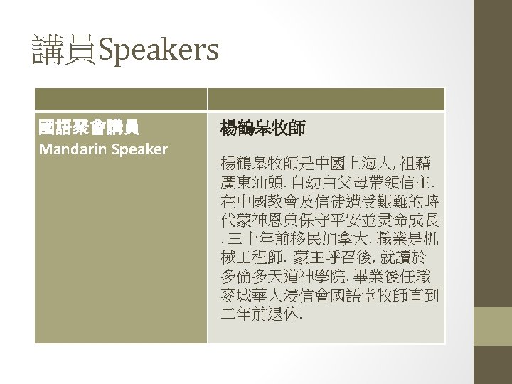 講員Speakers 英文聚會講員 English Speaker Rev. Daniel Lee studied at Tyndale Theological Seminary and graduated with his M. Div in pastoral ministry. In 2006, he took on the position of English Ministry Pastor of Markham Christian Community Church. On December 31, 2015, after close to ten years of pastoral ministry in Markham CCC, Rev. Daniel stepped down from his position with the church in order to focus his attention on completing his D. Min studies. Rev. Daniel has a passion for missions and for preaching the gospel.