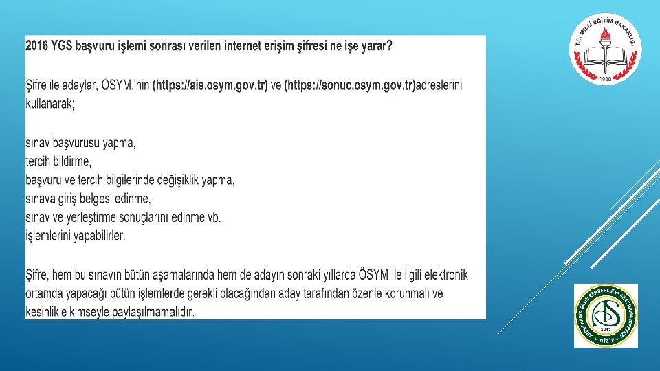 YGS PUANLARI NE İŞE YARAR? ØÖNLİSANS (2 YILLIK) ØAÇIKÖĞRETİM ØÖZEL YETENEK ØPOLİS MESLEK YÜKSEK OKULU ØASTSUBAY YÜKSEK OKULLARI ØBAZI LİSANS(4 YILLIK) PROGRAMLARINA YERLEŞMEK İÇİN KULLANILIR. • LYS’YE GİREBİLMEK İÇİN BİR BARAJ SINAVIDIR.