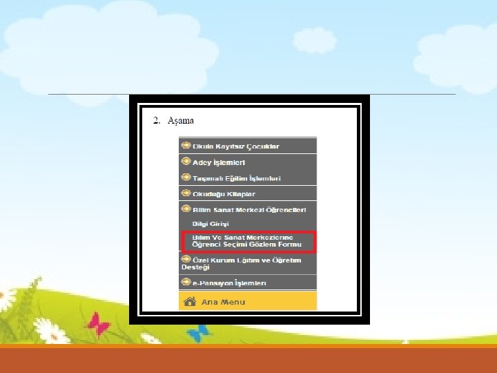 TARİH İŞLEM 23. 10. 2017 31. 10. 2017 İl Tanılama Sınav Komisyonunun Kurulması 24. 10. 2017 10. 11. 2017 Bilim ve Sanat Merkezlerine Öğrenci Seçimi ile İlgili İşlemler Hakkında Bilgilendirme Toplantılarının Yapılması 13. 11. 2017 29. 11. 2017 �Grup Tarama Uygulaması Giriş Ücretlerinin Banka Hesabına Yatırılması �Öğrenci Gözlem Formlarının Sınıf Öğretmenleri Tarafından e‐Okul Sisteminde Doldurulması 04. 12. 2017 08. 12. 2017 Gözlem Formu Doldurulan Öğrencilerin http: //www. meb. gov. tr İnternet Adresinden İlan Edilmesi ve Gerekli Düzeltmelerin Yapılması 11. 12. 2017 22. 12. 2017 Grup Tarama Uygulamasına Girecek Öğrencilerin MEBBİS/BİLSEM İşlemleri Modülü Üzerinden Uygulamaların Yapılacağı Merkezlere İl Tanılama Sınav Komisyonu Tarafından Yerleştirilmesi 26. 12. 2017 05. 01. 2018 Grup Tarama Uygulamasına Girecek Öğrencilerin Giriş Belgelerinin e‐Okul Sistemi Üzerinden Verilmesi 06. 01. 2018 04. 03. 2018 Grup Tarama Uygulamalarının Yapılması 09. 03. 2018 Grup Tarama Uygulama Sonuçlarının http: //www. meb. gov. tr Adresinden İlan Edilmesi
