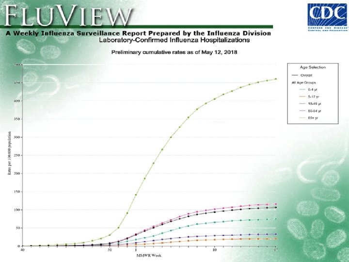 Vaccine Effectiveness Interim VE estimates Between 11/2/17 through 2/3/18 ~4, 500 enrollees in U. S. Flu VE Network Overall 36% effective against Influenza A & B VE was 59% in children aged 6 months through 8 years VE varies by type and subtype A (H 3 N 2) - 25% in all age groups Presented 3/25/18 51% children 6 months - 8 years A (H 1 N 1)pdm 09 – 67% in all age groups B (no lineage breakdown) – 42% in all age groups