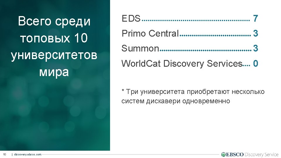 Топ десять университетов мира и их системы дискавери 2017 Academic Ranking of World Universities a. k. a. , “The Shanghai Ranking” 1. Harvard University 2. Stanford University 3. UC Berkley 4. Cambridge University 5. MIT 6. Columbia university 7. Princeton University 8. Caltech 9. Oxford University 10. University of Chicago 9 | discovery. ebsco. com