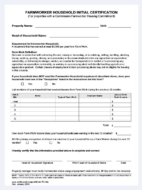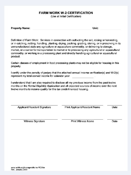 Farmwork Exceptions/ Clarifications • Clarifications to Farm Work Definition: Property managers should attach any necessary documentation to this form which demonstrates how household meets the Farm Work Definition. • Further clarification of Agriculture and Aquaculture can be found in the RCWs and WACs listed in the Farm Work Reference found in the Special -Needs section of our Resident Certification Forms website.