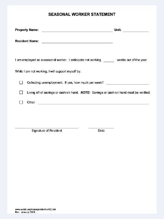 Determining Income of Sporadic Employees • Include anticipated income from all sources for full 12 months. • Use Seasonal Worker Statement to find out what the resident intends to do or earn during the off-season. • Try to match weeks off to verification(s).
