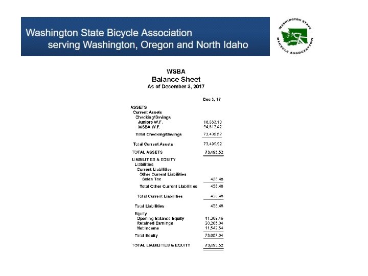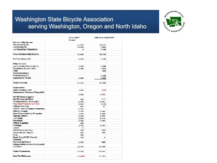 About the WSBA: • Revenue comes from USAC, WSBA memberships, and donations. • Primary expenses annually include replacing equipment, championship jerseys, and bib and frame numbers. • We seek out sponsorship to offset expenditures. • We pay nominal stipends to individuals who manage significant time-consuming tasks. • We conduct regular board calls (meetings) every 4 -6 weeks. We review our finances vs budget at least quarterly if not monthly. • We are constantly trying to find new ways to support competitive cycling in our region regardless of discipline and/or relation to USAC.