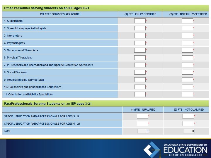 Personnel • Purpose: To report a count of FTEs of related services personnel and paraprofessionals working in schools who serve students on IEPs for any amount of time during the week. • Related services: fully certified and not – 11 discipline categories • Paras: qualified and not – By age group