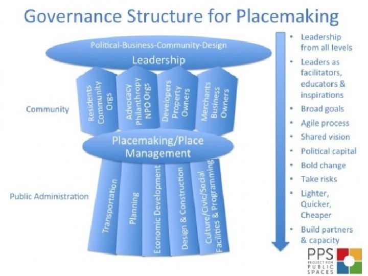 Need to grow community • Governance, on every scale, is not set up to create great places. • Shifting power and responsibility for governance to communities allows for more efficient and dynamic models to emerge. No more are places and place making something that government, solely, delivers for communities. It is those communities developed by everyone, not those that are developed by government, that will most thrive in the future.