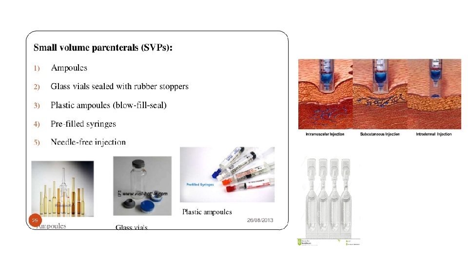 Types of Parenteral Drug Forms 1. Small volume (<100 ml) injectables 2. Large volume (>100 ml) injectables 3. Modified release (sustained-release) injectables (SVIs delivered by routes other than IV)