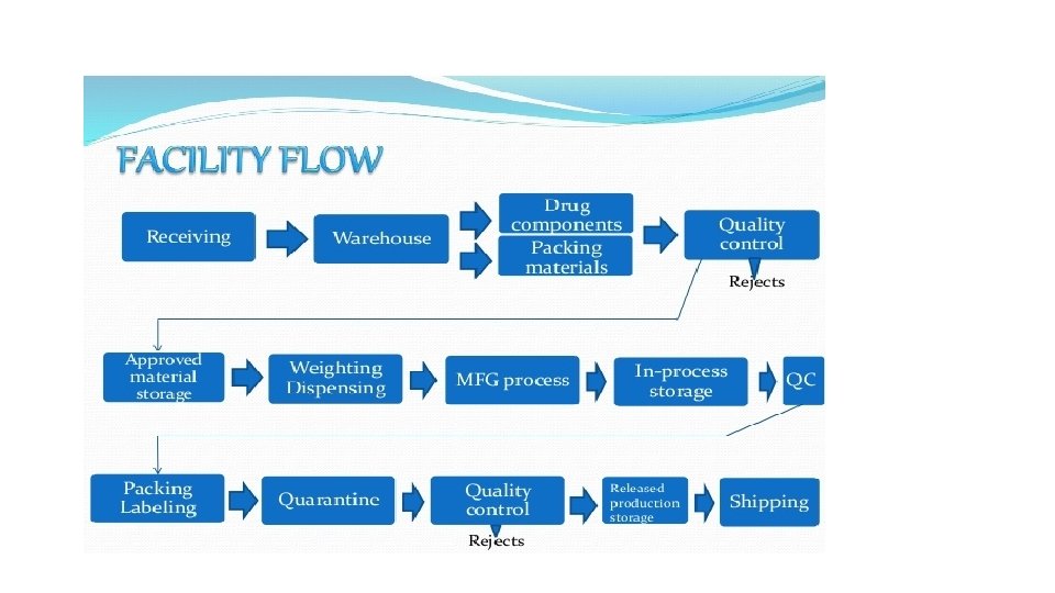 Manufacturing Facilities • The manufacturing facilities should be designed, constructed, and operated properly for the production of a pharmaceutical product with the excellent quality required for safety and effectiveness. • Materials used in manufacturing facility must be smooth, cleanable, and impervious to moisture and other damage. • All connections or junctions between ceilings, walls, and floors cannot be 90 degree angles but covered for easy cleaning. • There should be no gaps, cracks, recesses, or other defects that can harbors for microbial contamination. • Air systems, lighting, and communication systems require special design to be easily accessible without disturbing the normal air flow. • Air pressure should be controlled so air flows from higher classifications (Grade A) to lower classifications (Grade C). • Doors should be self-closing and interlocked so only one door opens at a time.