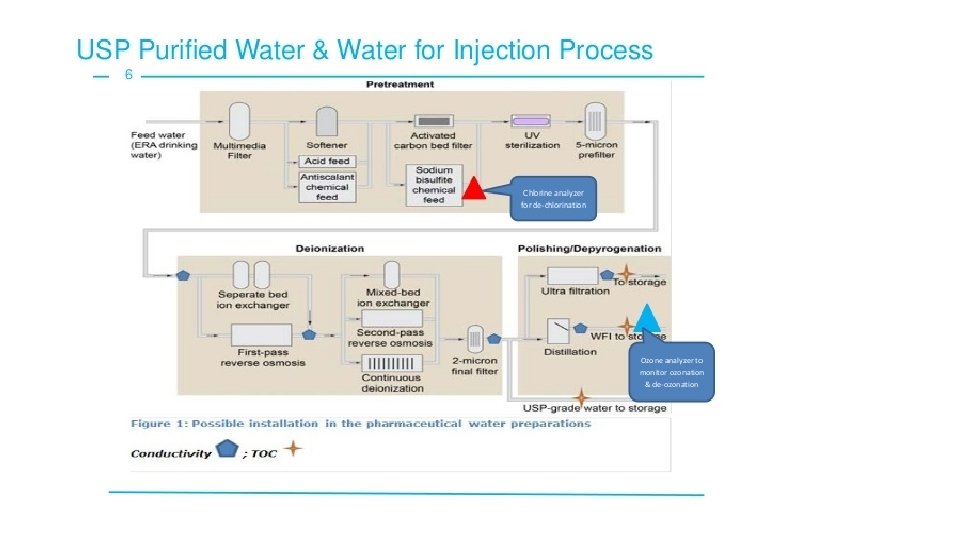 • WFI can be prepared by distillation or Reverse Osmosis (RO) or Ultrafiltration (UF). The European Pharmacopeia (EP) permits distillation as the only process for producing WFI, but the USP and Japanese Pharmacopeia (JP) allow other technologies as well. • Potential impurities in feed water (city water) include bacteria, endotoxins, particles, electrolytes, organics, colloids, and disinfectants such as chlorine. • Water purification methods include: Ø Distillation – a process of converting water from a liquid to its gaseous form. Since steam is pure and other contaminants are removed.