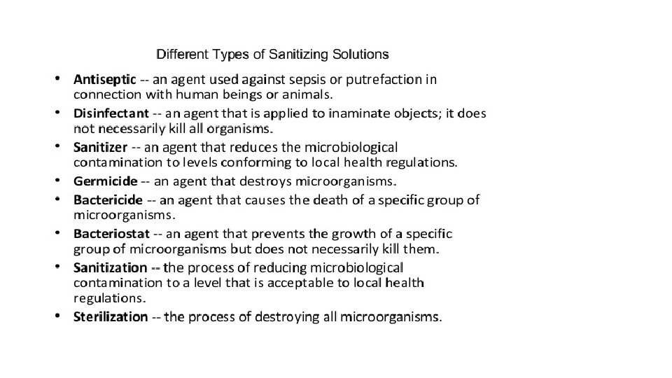• Clean room maintenance Ø Carefully planned schedule of cleaning by an expertly trained custodians should be implemented. Cleaning tools should be nonlinting. Ø Sanitization/disinfection agents – chemicals reducing the microbial bioburden. They are not sterilization agents! Ø Quaternary ammonium compounds, phenolic mixtures, alcohols, biguanides, formaldehyde, chloride, peroxide, glutaraldehyde, etc. Ø Lp. H (Steris Corp. ) is well known. Sanitizing agents are normally not sporocides!