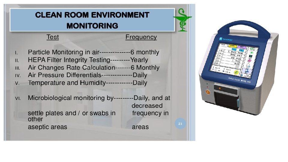 Clean room classified areas • Manufacturing areas have standard criteria for the acceptable maximum limit of airborne particles greater than or equal to 0. 5 micron per cubic foot or meter. • Air Classification Systems – accordance with the FDA and EU guidelines • Particle counts must be measured during filling and closing operations.