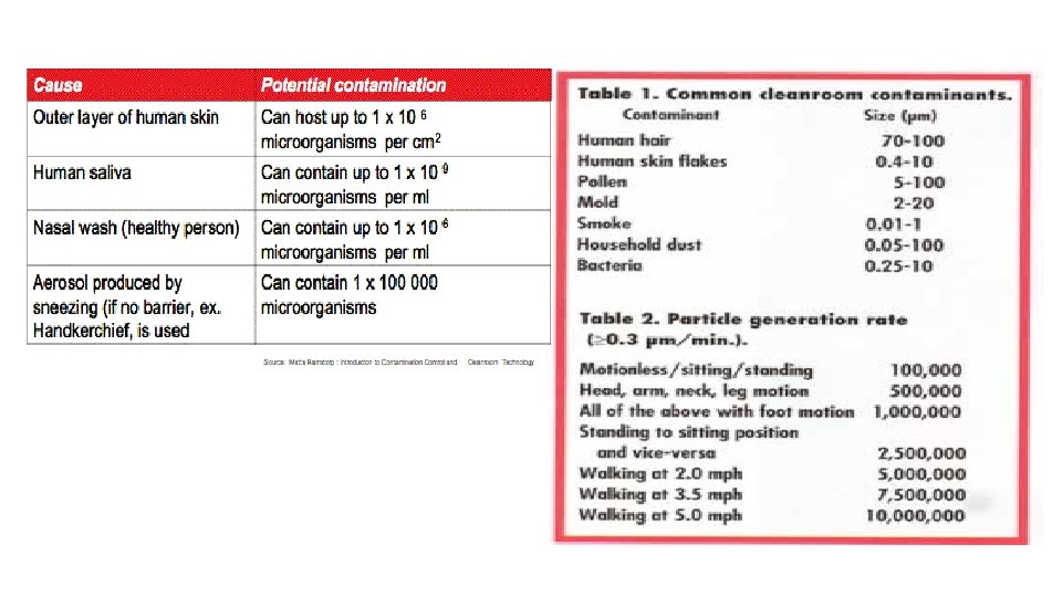 ØBuildings – walls, ceilings, and plasters can contain mold contamination. Floors with cracks filled with water can also offer contamination of microbial growth. ØEquipment – hard to clean locations like screw threads, agitator blades, valves, and pipe joints can harbor microbial contaminations. ØPeople – the largest single source of contamination. Skin, hair, moisture from breathing, coughing, sneezing, cosmetics and clothing are sources of microbial contamination. Movement like a simple walking can emit more than 10, 000 particles per minute.