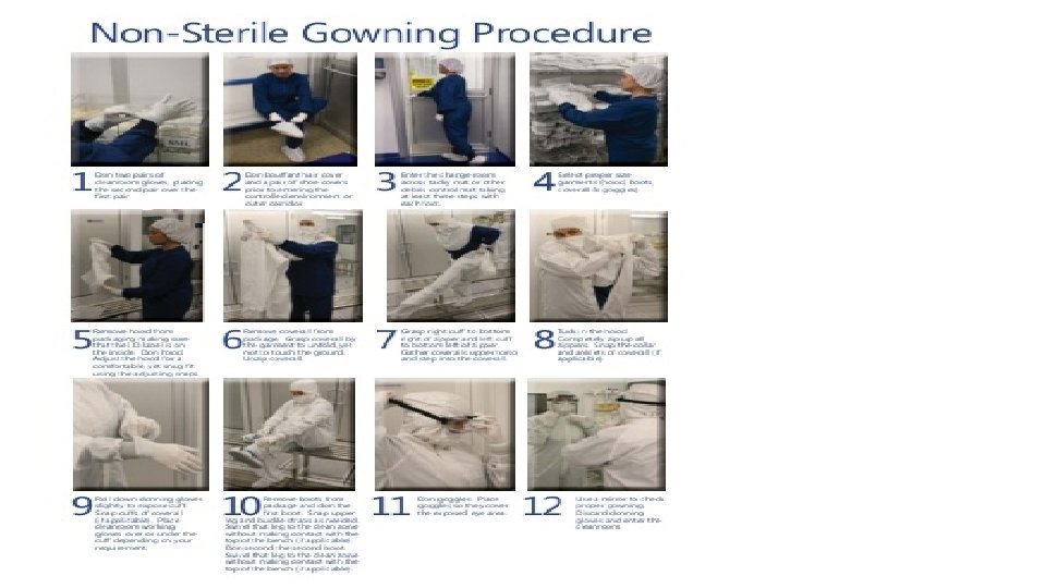 • Airborne contamination is directly related to the number of people working in a given area. Number of people and degree of activities must be kept to a minimum. Talking, unnecessary bodily movement and anything that interrupts the flow of laminar air should be avoided. • Cleanroom gowns are designed to confine the contaminants discharged from the body of the operator, preventing the entry into the cleanroom. • Fresh and sterile gowns should be used whenever an individual returns to the aseptic area. • Full gowns consist of coveralls, hoods, face masks, goggles, boot covers, and double gloves. • There is no universally accepted gowning procedure for the sequence of gowning steps but the general sequence is described in the next page.