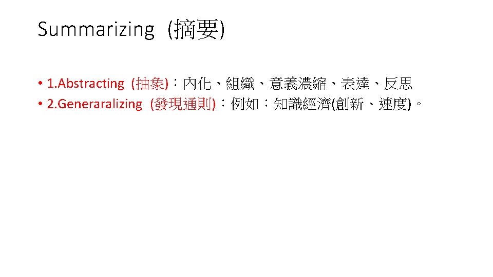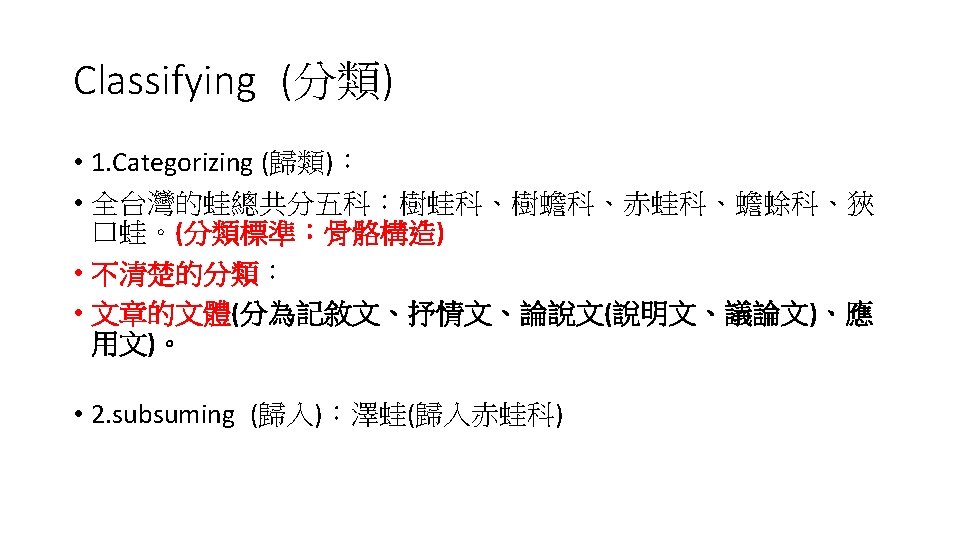Understand(理解) • 1. Interpreting(詮釋) • 2. Exemplifying(舉例) • 3. Elassifying(分類) • 4. Summarizing(摘要) • 5. Inferrig(推論) • 6. Comparing(比較) • 7. Explaining(解釋)