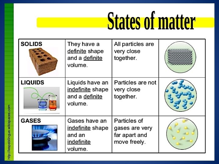 Kinetic Theory of Matter • All matter is made of particles; these particles have energy. • Increasing the temperature of a substance, transfers energy to the particles in the substance, causing them to move faster. • When the particles move around faster, they bump into each other, spreading the energy to other particles. • Increases or decreases in energy often causes molecules to change to a different state.