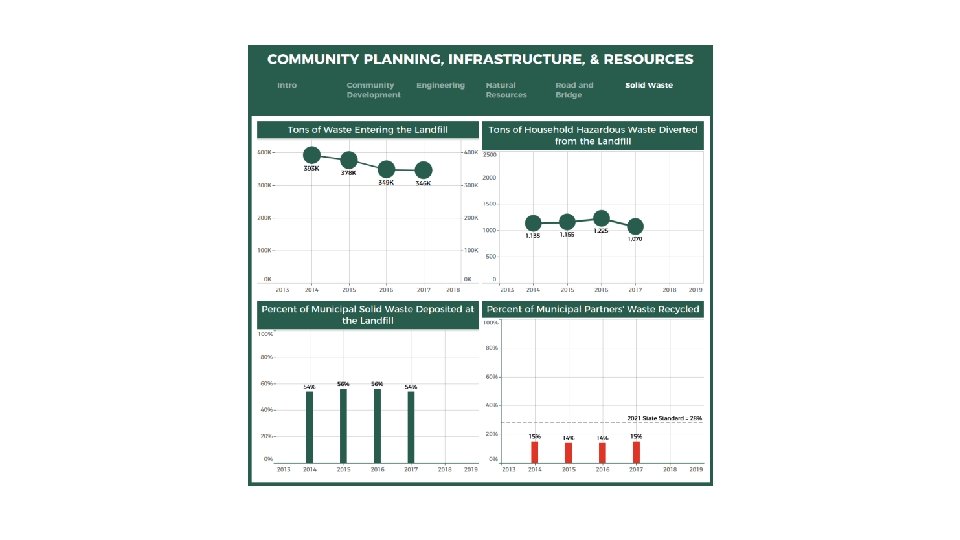 Infrastructure Options for Consideration » » » Status Quo Central Transfer Station New County Landfill Material Recovery Facility (Clean) Yard Waste Organics Processing Facility C&D Processing Facility Energy from Waste Facility (Direct Combustion) Mixed Waste Processing (Dirty MRF) Aerobic Composting Including Food Waste Anaerobic Digestion Refuse Derived Fuel (RDF) Processing