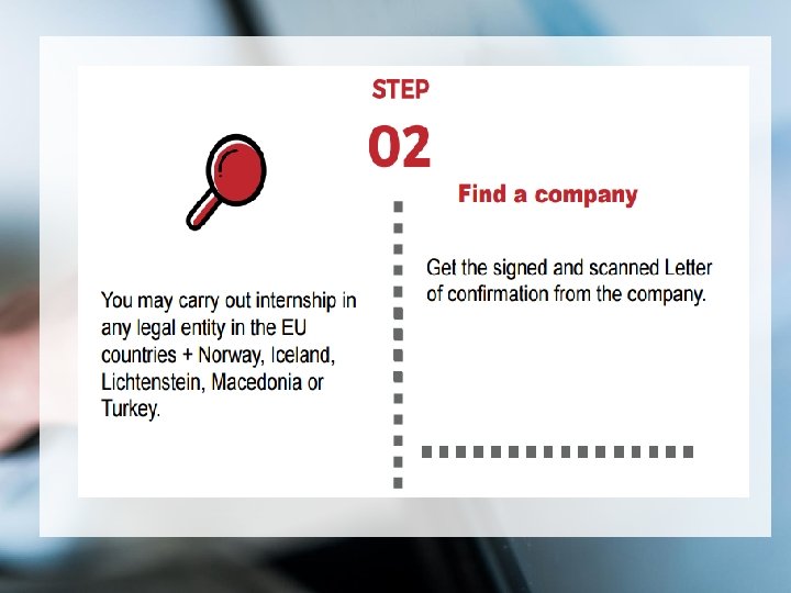 2. Susiraskite priimančią įmonę • Įmonės susiradimas yra didžiausias iššūkis visame praktikos užsienyje procese. Tačiau jeigu šimtams studentų pasisekė ją susirasti, tai pavyks ir jums! • Iškilus klausimams, ar ieškant tinkamiausios įmonės visada galite kreiptis į savo praktikos vadovą (klausti katedroje). • Mano VGTU Erasmus+ praktikos skiltyje rasite nuorodų ir rekomendacijų kaip ieškoti įmonės. Taip pat sekite URD Facebook paskyrą – čia skelbiamos įmonių užklausos. • Daugiau patarimų kaip surasti įmonę čia.
