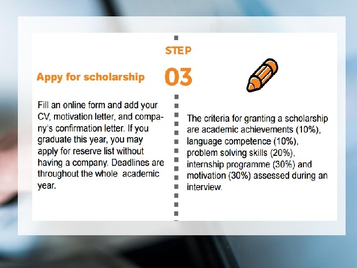3. Teikite paraišką stipendijai gauti Norėdami pateikti paraišką stipendijai gauti, jūs turite: 1. Užpildyti elektroninę formą (nuorodą rasite Mano VGTU); 2. Išsiųsti pasirašytą skenuotą paraišką ir papildomus dokumentus (praktikos sutartis su įmonės ir praktikos vadovo ir/ar Fakulteto Erasmus koordinatoriaus parašais, CV, motyvacinis laiškas) elektroniniu paštu internship@vgtu. lt.