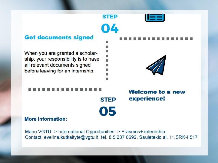 5. Pradėkite praktiką! Praktikos metu mes paprašysime jūsų atsiųsti (formas rasite mano VGTU skiltyje Erasmus+ praktika): • Atvykimą patvirtinančią registracijos formą • Tarpinę ataskaitą