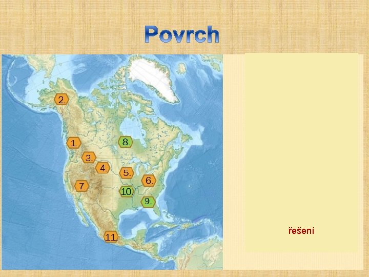 Pohoří: Kordilery - nejdelší suchozemské pohoří na světě - vznikly 3. horním vrásněním - v Jižní Americe – Andy � Kaskádové pohoří � Sierra Nevada � Aljašské hory – Denali /= Mount Mc. Kinley/ (nejvyšší hora SA – 6194 m. n. m. ) � Skalnaté hory � Appalačské pohoří � Brooksovo pohoří � Mackenzieovo pohoří � Sierra Madre (vých. , záp. , již. ) Plošiny – Kolumbijská, Koloradská, Mexická Pánve – Velká � Mount Mc. Kinley