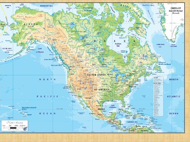 Největší ostrovy, souostroví: Grónsko (největší ostrov na světě – 2, 1 mil. km 2) Arktické souostroví • Baffinův ostrov • Viktoriin ostrov • ostrov Devon souostroví Velké Antily • Kuba • Jamajka Grónsko • Hispaniola Arktické souostroví • Portoriko souostroví Malé Antily souostroví Bahamy Velké Antily