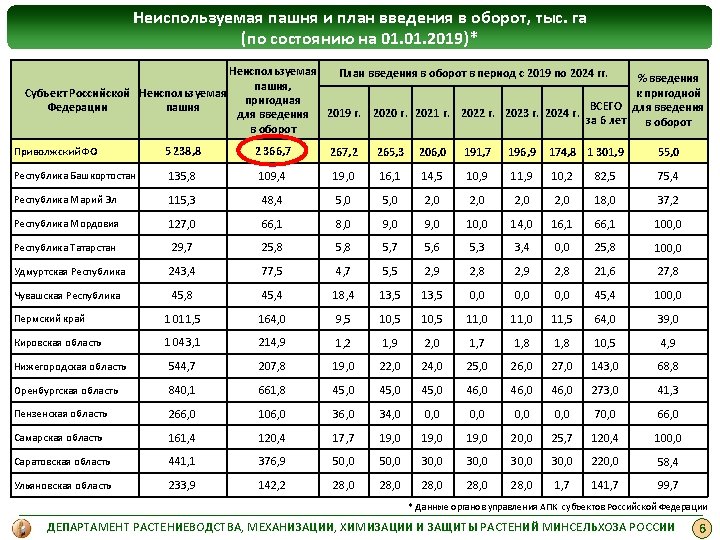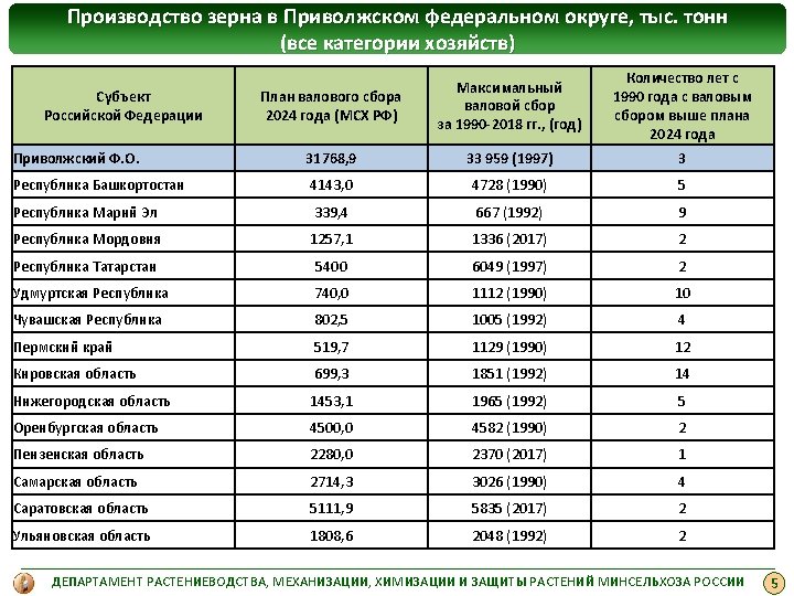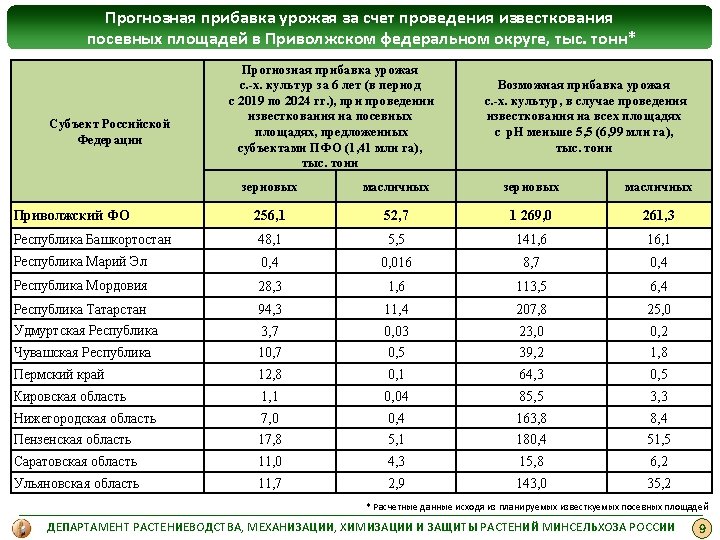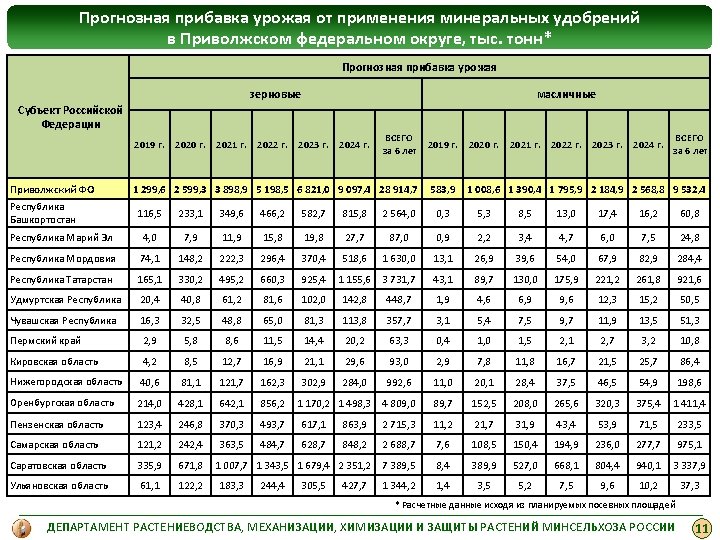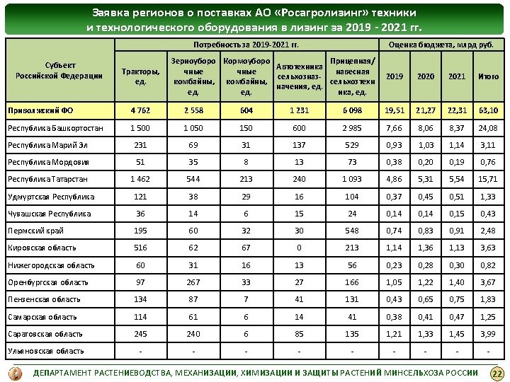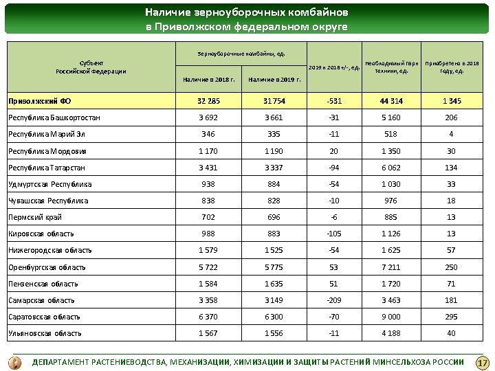 Прогноз приобретения зерноуборочных комбайнов в Приволжском федеральном округе Прогноз приобретения зерноуборочных комбайнов, ед. Субъект Российской Федерации 2019 г. 2020 г. 2021 г. 2022 г. 2023 г. 2024 г. Прогно з Норма регион тив а Прогно з Норма регион тив а +/- +/- +/- Российская Федерация 5 427 7 832 -2 405 5 606 9 789 -4 183 5 638 12 237 -6 599 5 792 15 296 -9 504 5 849 19 120 -13 271 5 905 23 900 -17 995 Приволжский ФО 1 549 2 018 -469 1 589 2 522 -933 1 621 3 152 -1 531 1 646 3 940 -2 294 1 649 4 926 -3 277 1 665 6 157 -4 492 Республика Башкортостан 225 309 -84 215 386 -171 213 483 -270 208 604 -396 198 754 -556 183 943 -760 Республика Марий Эл 21 6 15 23 8 15 25 9 16 28 12 16 32 15 17 36 18 18 Республика Мордовия 50 45 5 55 56 -1 65 70 -5 75 88 -13 80 110 -30 80 137 -57 Республика Татарстан 178 201 -23 180 251 -71 186 314 -128 189 393 -204 183 491 -308 191 613 -422 Удмуртская Республика 38 50 -12 44 62 -18 47 77 -30 41 97 -56 42 121 -79 39 151 -112 Чувашская Республика 22 27 -5 21 34 -13 20 42 -22 23 53 -30 21 66 -45 21 82 -61 Пермский край 33 20 13 34 24 10 36 30 6 37 38 -1 39 48 -9 41 60 -19 Кировская область 26 20 6 34 24 10 30 30 0 24 38 -14 14 48 -34 19 60 -41 Нижегородская область 46 86 -40 54 107 -53 47 134 -87 46 167 -121 45 209 -164 39 261 -222 Оренбургская область 250 375 -125 250 469 -219 257 586 -329 265 732 -467 273 916 -643 281 1 144 -863 Пензенская область 117 10 121 133 -12 126 166 -40 131 208 -77 136 260 -124 141 325 -184 Самарская область 160 272 -112 166 339 -173 168 424 -256 170 530 -360 168 663 -495 166 829 -663 Саратовская область 315 443 -128 320 553 -233 325 691 -366 330 864 -534 335 1 080 -745 340 Ульяновская область 68 60 8 72 75 -3 76 94 -18 79 117 -38 83 146 -63 88 1 350 -1 010 183 ДЕПАРТАМЕНТ РАСТЕНИЕВОДСТВА, МЕХАНИЗАЦИИ, ХИМИЗАЦИИ И ЗАЩИТЫ РАСТЕНИЙ МИНСЕЛЬХОЗА РОССИИ -95 18