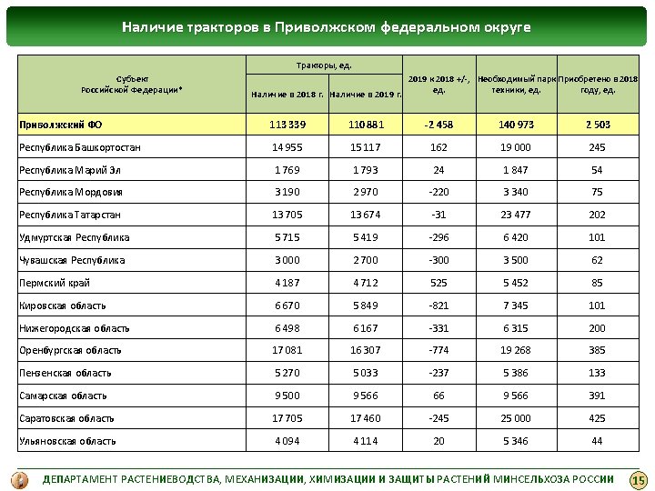 Прогноз приобретения тракторов в Приволжском федеральном округе Прогноз приобретения тракторов, ед. 2019 г. Субъект Российской Федерации Прогно з Норма регион тив а Приволжский ФО +/- 2020 г. 2021 г. 2022 г. 2023 г. 2024 г. Прогно з Норма регион тив а Прогно з Норма регион тив а +/- 5 866 -2 481 3 456 +/- 7 333 -3 877 3 408 +/- 3 282 3 755 -473 3 403 4 693 -1290 3 385 9 166 -5 758 3 490 11 458 -7 968 Республика Башкортостан 365 368 -3 358 459 -101 328 574 -246 328 718 -390 304 897 -593 311 1 122 -811 Республика Марий Эл 73 81 -8 78 101 -23 80 127 -47 85 158 -73 88 198 -110 88 247 -159 Республика Мордовия 60 113 -53 70 141 -71 75 176 -101 80 220 -140 80 275 -195 90 343 -253 Республика Татарстан 465 303 162 503 379 124 494 473 21 514 592 -78 488 740 -252 542 925 -383 Удмуртская Республика 183 152 31 173 189 -16 176 237 -61 173 296 -123 187 370 -183 162 462 -300 Чувашская Республика 68 93 -25 69 116 -47 69 145 -76 69 182 -113 68 227 -159 68 284 -216 Пермский край 112 128 -16 114 159 -45 117 199 -82 120 249 -129 122 311 -189 125 389 -264 Кировская область 143 152 -9 154 189 -35 122 237 -115 119 296 -177 93 370 -277 87 462 -375 Нижегородская область 135 300 -165 140 375 -235 136 469 -333 147 586 -439 132 732 -600 142 916 -774 Оренбургская область 470 578 -108 470 722 -252 484 902 -418 499 1 128 -629 514 1 410 -896 529 Пензенская область 158 200 -42 170 249 -79 178 312 -134 186 390 -204 191 487 -296 201 Самарская область 414 587 -173 422 733 -311 420 916 -496 418 1 146 -728 421 1 432 -1 011 421 1 790 -1 369 Саратовская область 560 638 -78 600 797 -197 620 996 -376 630 1 245 -615 630 1 556 -926 630 1 945 -1 315 Ульяновская область 76 66 10 82 83 -1 86 103 -17 88 129 -41 90 161 -71 94 1 762 -1 233 609 -408 201 -107 ДЕПАРТАМЕНТ РАСТЕНИЕВОДСТВА, МЕХАНИЗАЦИИ, ХИМИЗАЦИИ И ЗАЩИТЫ РАСТЕНИЙ МИНСЕЛЬХОЗА РОССИИ 16