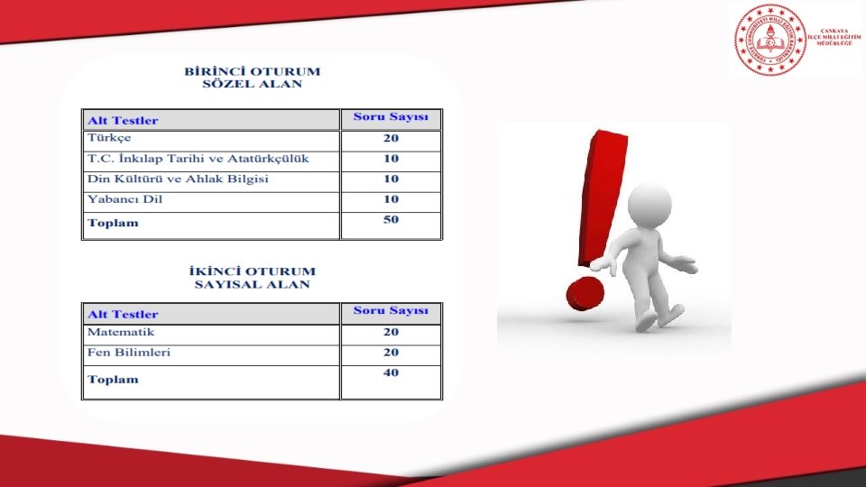 Ek süre verilen özel eğitim ihtiyacı olan öğrencilerde; Yabancı Dil alt testinden muaf olanların birinci oturumdaki toplam süresi 80 dakika, Din Kültürü ve Ahlak Bilgisi alt testinden muaf olanların birinci oturumdaki toplam süresi 80 dakika, Yabancı Dil ve Din Kültürü ve Ahlak Bilgisi alt testlerinden muaf olanların birinci oturumdaki toplam süresi 65 dakika olarak uygulanacaktır. Din Kültürü ve Ahlak Bilgisi alt testinden muaf olan öğrencilerin birinci oturumdaki toplam süresi 60 dakika olarak uygulanacaktır.