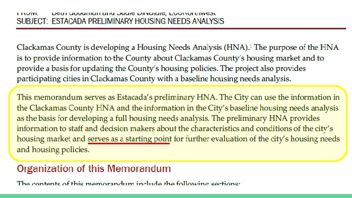 Notes from HLA & FHCO on Statewide Housing Goal: Exhibit 16 is a letter from HLA (Housing Land Advocates) and FHCO (Fair Housing Council of Oregon) calling for the City to reference its HNA (housing needs analysis) on any land use decision related to residential land supply. - - Estacada’s last housing needs analysis was done in 1979, projecting to 2000. Estacada participated in Clackamas County’s Regional Housing Needs Analysis and received a baseline assessment of housing needs (2019 Housing Memo). The 2019 Housing Memo is a preliminary housing needs assessment, not an HNA. It serves as a starting point for the City to complete its own HNA.