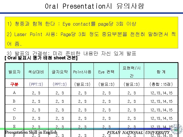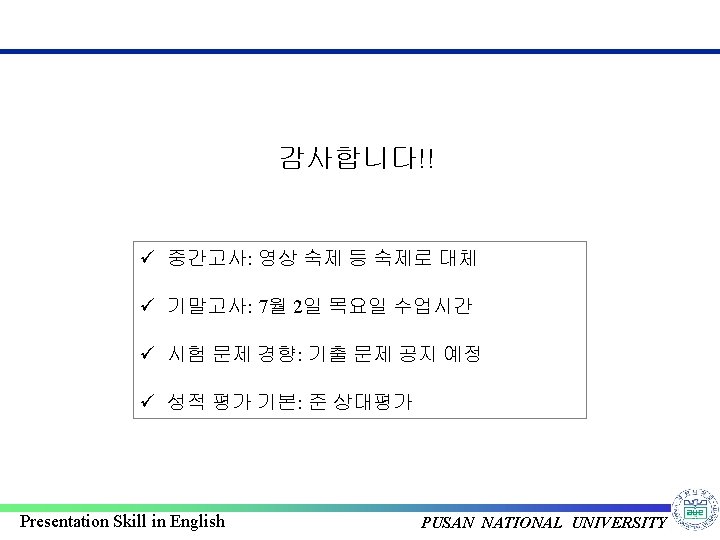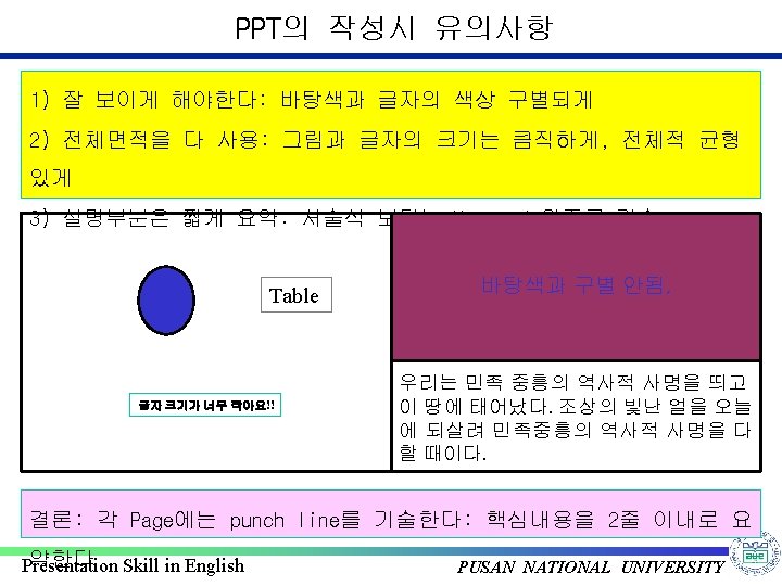 Example: Oral Presentation in English v 영어로 PPT 발표시 사용하면 좋은 표현: 2/2 There is ~ 단수 , There are ~ 복수 The major application [role, function, principle] of A is ~ When you increase[decrease] the temperature [pressure], ~ When you apply the voltage on the A, ~ What I want to say is ~ The point I want to say is ~ * 동사: Produce, generate, create, occur, observe, explain, measure, verify, * Consist = be composed of / because of / effect of A on B etc. Presentation Skill in English PUSAN NATIONAL UNIVERSITY