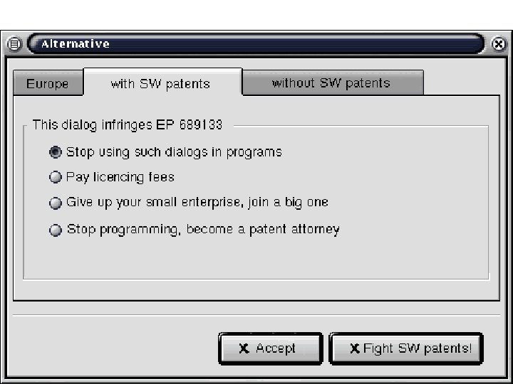 ”Mjukvarupatent” • ”Direktivet om datorrelaterade uppfinningar”, allmänt kallat ”mjukvarupantentdirektivet”, var ett förslag som förkastades av Europaparlamentet 2005. • Förslaget inkluderade”Datorimplementerade affärsmetoder”. • Mjukvarupatent något lättare att få i USA.