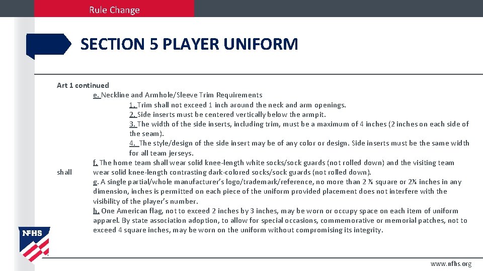 Rule Change SECTION 5 PLAYER UNIFORM Art 1 continued e. Neckline and Armhole/Sleeve Trim Requirements 1. Trim shall not exceed 1 inch around the neck and arm openings. 2. Side inserts must be centered vertically below the armpit. 3. The width of the side inserts, including trim, must be a maximum of 4 inches (2 inches on each side of the seam). 4. The style/design of the side insert may be of any color or design. Side inserts must be the same width for all team jerseys. f. The home team shall wear solid knee-length white socks/sock guards (not rolled down) and the visiting team shall wear solid knee-length contrasting dark-colored socks/sock guards (not rolled down). g. A single partial/whole manufacturer’s logo/trademark/reference, no more than 2 ¼ square or 2¼ inches in any dimension, inches is permitted on each piece of the uniform provided placement does not interfere with the visibility of the player’s number. h. One American flag, not to exceed 2 inches by 3 inches, may be worn or occupy space on each item of uniform apparel. By state association adoption, to allow for special occasions, commemorative or memorial patches, not to exceed 4 square inches, may be worn on the uniform without compromising its integrity. www. nfhs. org